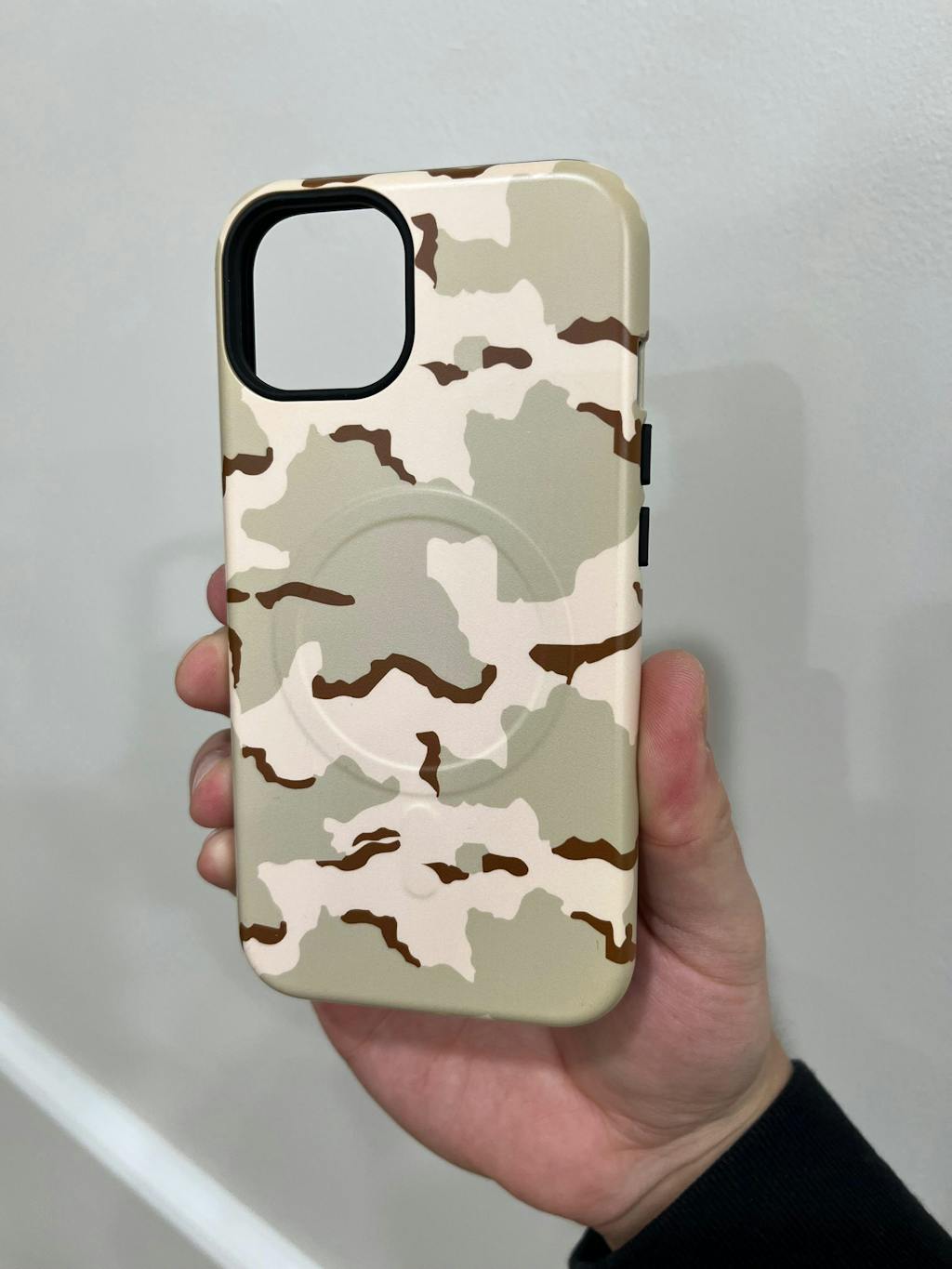 A full edge-to-edge 3D wrap print ensures the desert camouflage pattern flows seamlessly across the entire case, maintaining consistent color and detail from every angle. An integrated MagSafe®-compatible magnetic module allows for fast wireless charging and secure attachment to MagSafe® accessories—no slipping, no alignment issues.